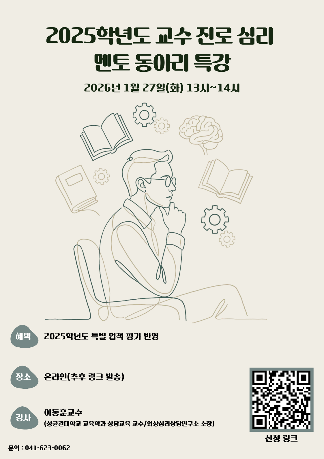 | 천안 [학생생활] | [학생상담센터] 2025학년도 교수 진로 심리 멘토 동아리 특강 |