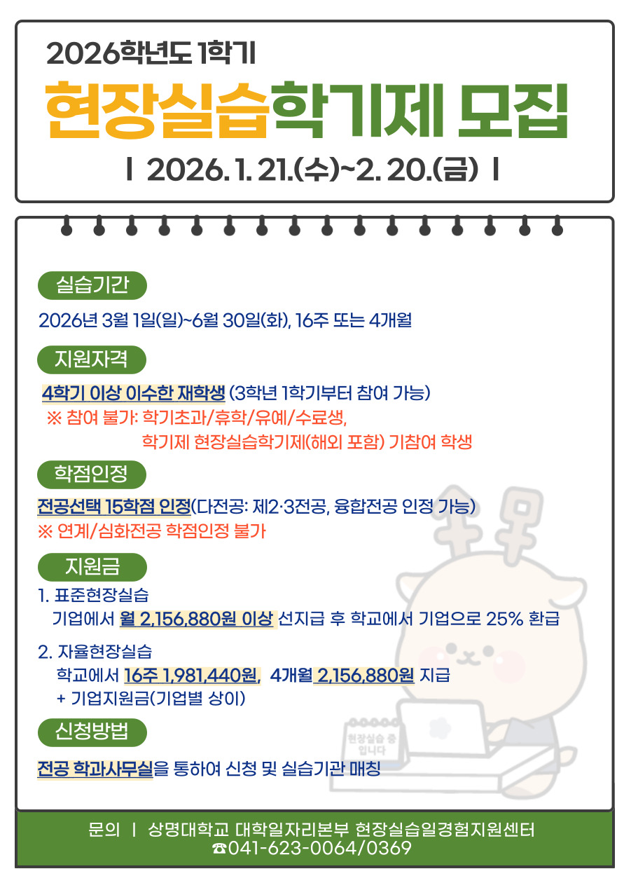 | 천안 [진로취업] | [현장실습·일경험지원팀] 2026학년도 1학기 현장실습학기제 시행 공고 |